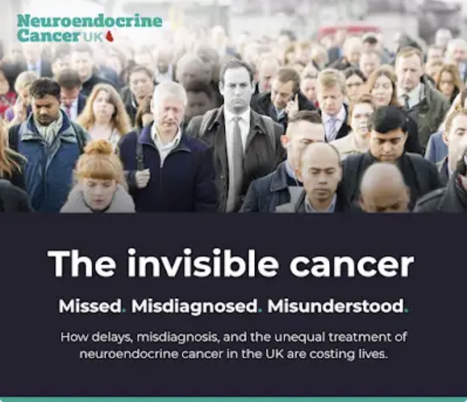 Neuroendocrine cancer is largely invisible, and the consequences are significant. It is missed, misdiagnosed and misunderstood. It takes an average of 4.5 years to be diagnosed from first symptom, and this delay causes real harm. Our report calls for greater recognition and understanding, with the aim of supporting earlier diagnosis and better care.